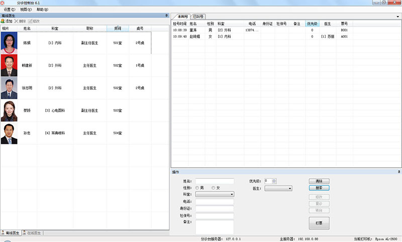 掛號完畢后,患者持掛號單、病歷本前往掛號科室所在的分診臺找分診護士。此處分診臺需要配置一臺分診電腦,電腦里需要安裝排隊系統(tǒng)分診軟件,護士通過該軟件可以找到已掛號的患者姓名,然后打印出該名患者的排隊號票。患者也可以指定需要就診的醫(yī)生(限同一類別),護士可以很方便的從分診軟件中進行選擇,患者拿到號票后即可在該科室集中等候區(qū)等候叫號。