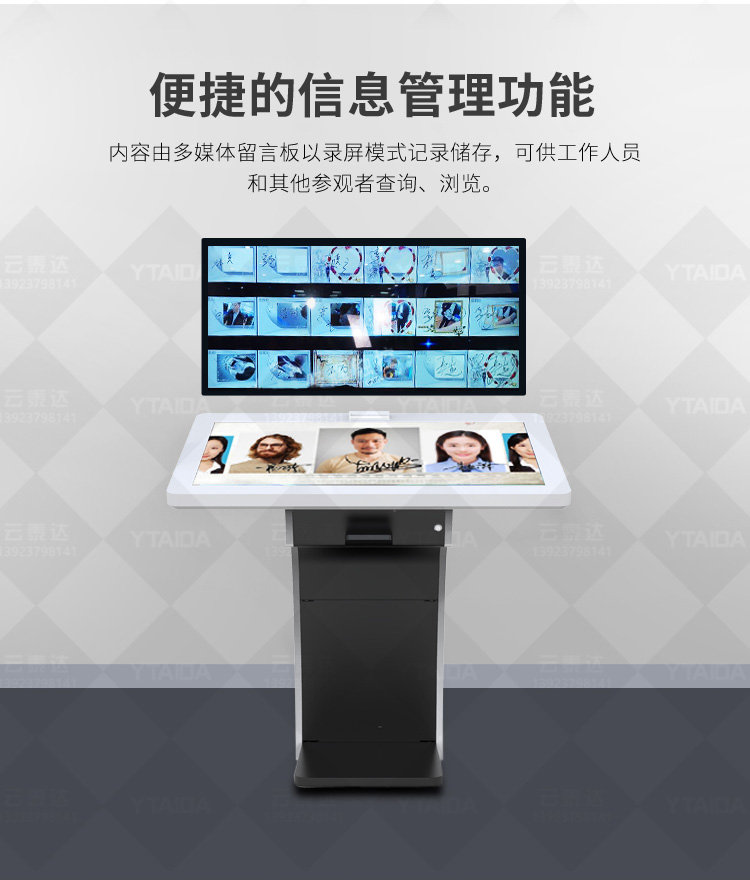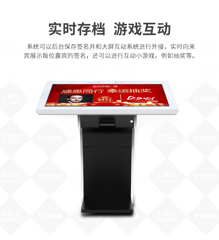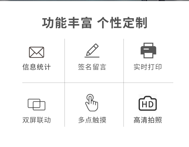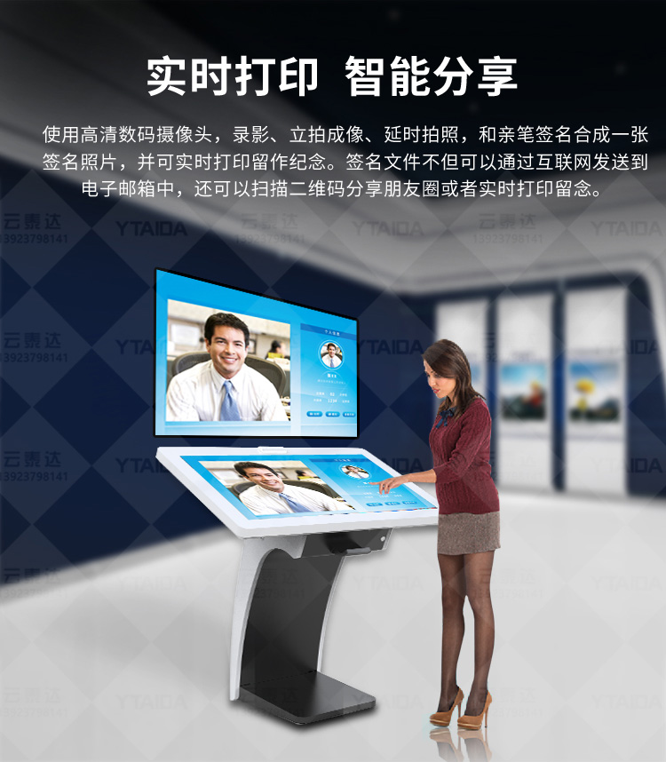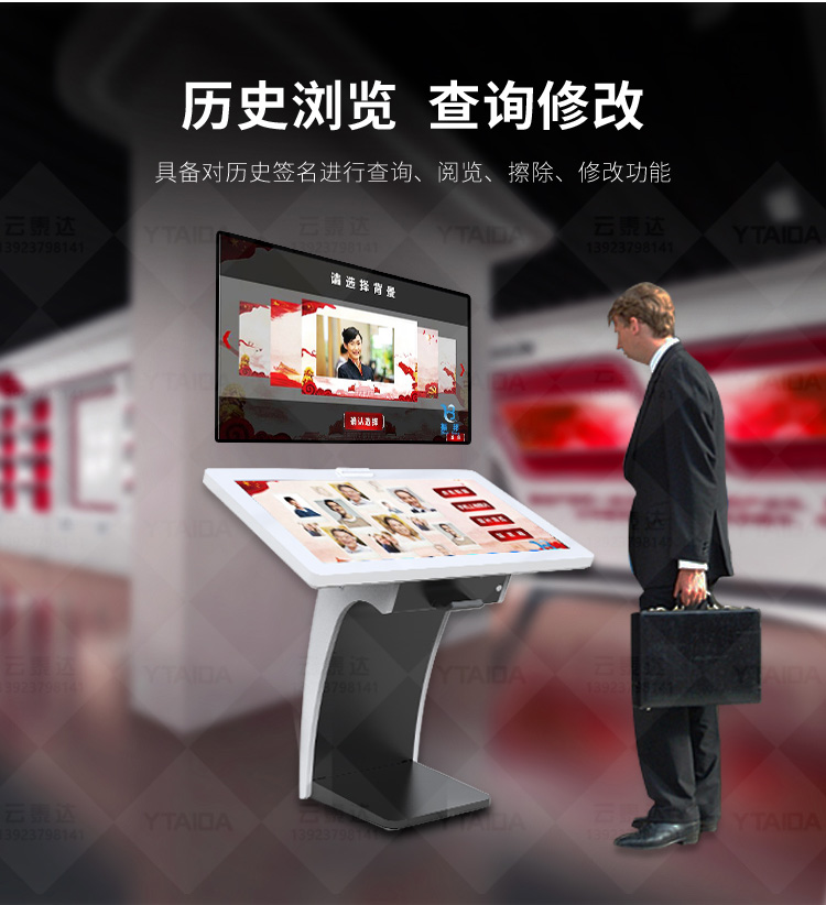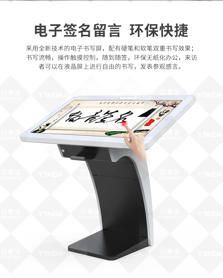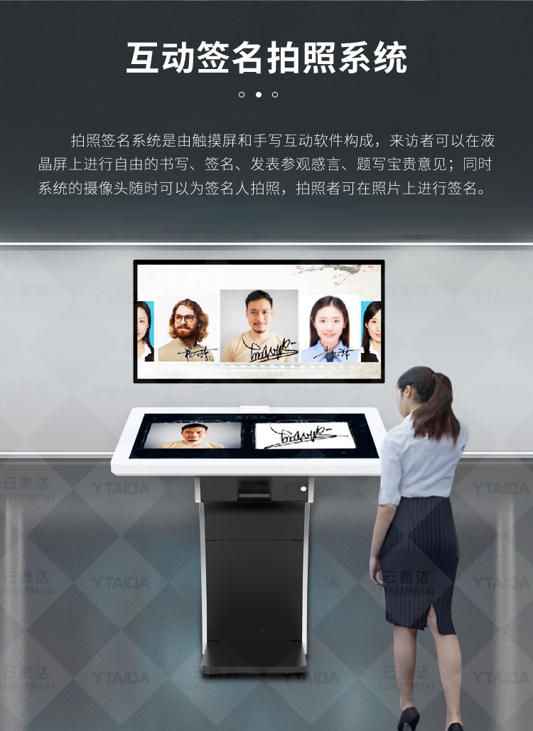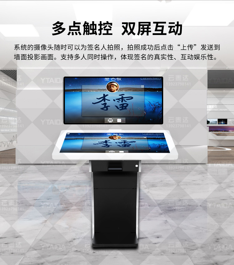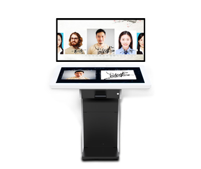 電子簽名拍照系統作為新一代多媒體留言冊,將數字毛筆簽名影像捕捉、影像合成、配音配樂、多屏顯示技術、信息統計、實時打印等技術融為一體,配備多點觸摸屏、大容量硬盤、高清攝像機、外接LED及液晶拼接等大屏幕終端設備,實現互動的多媒體終端設備的高科技互動產品。來訪者可以在液晶屏上進行自由的書寫,發表參觀感言、提寫寶貴意見、留下紀念。內容由多媒體留言板以錄屏模式記錄存儲,使游客寫畫在手寫屏上的任何文字、圖形或插入的任何圖片都可以被保存至硬盤存儲設備,并可供館方服務人員和其他游客查詢、瀏覽。