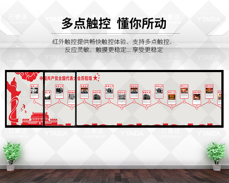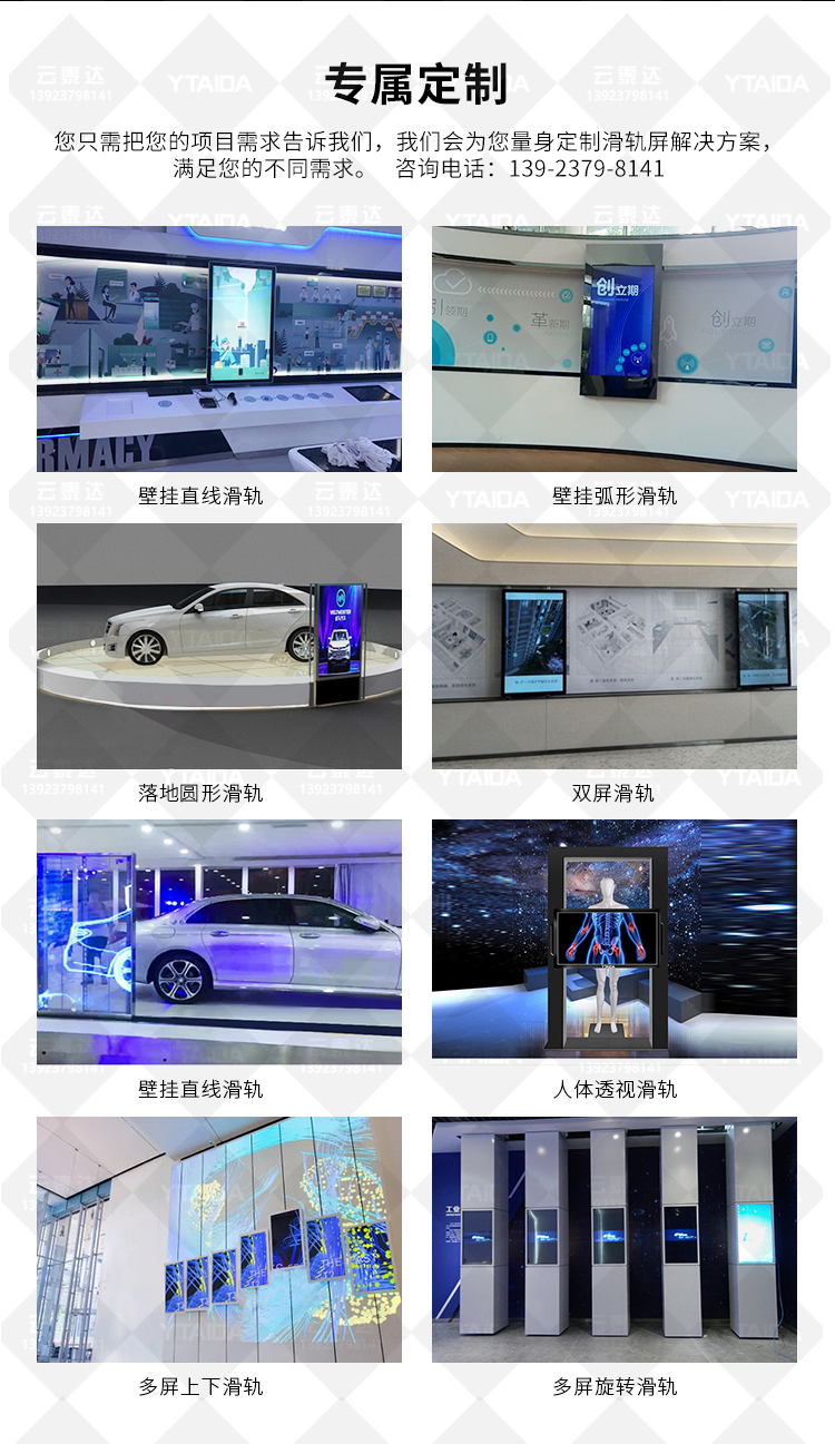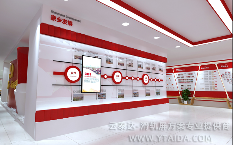 滑軌屏由定制滑行軌道、等離子電視、紅外傳感器、燈箱、計(jì)算機(jī)組成。在類似坐標(biāo)軸的展墻上鑲嵌各種案例圖片,同時(shí)制作一組可滑動(dòng)的機(jī)械結(jié)構(gòu)以懸掛屏幕。