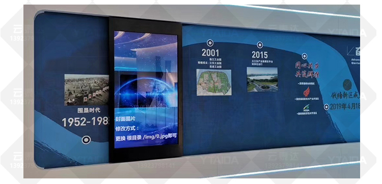 滑軌屏在類似坐標(biāo)軸的展墻上鑲嵌各種案例圖片,同時(shí)制作一組可滑動(dòng)的機(jī)械結(jié)構(gòu)以懸掛液晶電視,該展項(xiàng)在相應(yīng)圖片上設(shè)置了不同的觸摸點(diǎn)位,通過(guò)隔空感應(yīng)傳感裝置,參觀者可以上下左右互動(dòng)推拉電視機(jī),尋找背景中的感應(yīng)點(diǎn),當(dāng)參觀者推拉電視到不同感應(yīng)點(diǎn)位,此時(shí)傳感信號(hào)被觸發(fā),屏幕便自動(dòng)展示相應(yīng)點(diǎn)位的三維動(dòng)畫(huà)細(xì)節(jié)。