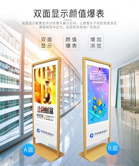 雙面廣告機除了承繼了傳統單屏廣告機的特點,除了繼承了以往高清晰、高亮度、高對比、寬視角、快響應、低功耗之外,雙面廣告機也可以選配包括WIFI無線、藍牙等網絡功能···?????? ????? [查看詳情]